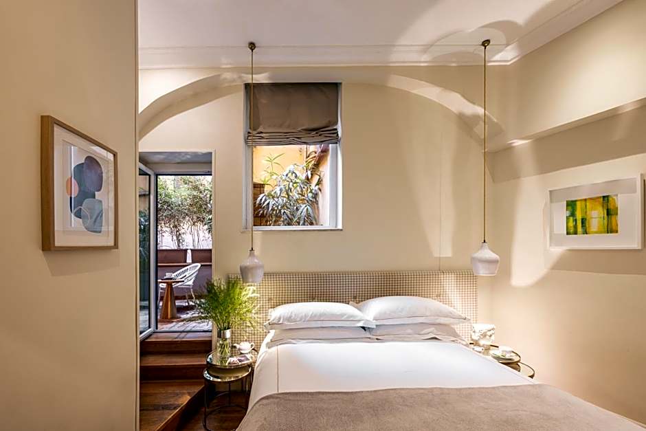 Elegance, prestige, and space: the Master Suite is set on two levels with a window overlooking the Forum of Augustus. This is a particularly large room and suitable for those who love to have their own trendy and comfortable suite right in ancient Rome. The Master Suite takes its inspiration from Roman architecture mixed with contemporary design and its fine details will make you feel at home. The paintings and photographs on the walls have been carefully chosen to suit the suite and include a mix of limited editions of contemporary photographers and painters. This room features a Smart TV 50'.